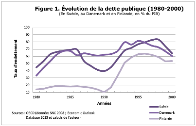 L’évolution de la dette publique et des dépenses sociales en Suède, au Danemark et en Finlande entre 1980 et 2000 met en évidence deux faits stylisés. Premièrement, les trois pays connaissent une dégradation significative de leurs finances publiques, selon des temporalités distinctes (figure 1).