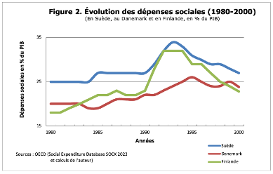 Le Danemark amorce un ajustement dès le début des années 1980, tandis que la Suède et la Finlande connaissent une détérioration rapide au début des années 1990. La dette publique suédoise passe ainsi d’environ 40 % du PIB en 1990 à plus de 80 % à la fin de la décennie, tandis que celle de la Finlande augmente d’environ 10 % à plus de 60 % du PIB entre 1990 et 1996. Deuxièmement, malgré ces tensions budgétaires, les dépenses sociales restent durablement élevées (figure 2). Elles augmentent même temporairement au début des années 1990, notamment en Finlande, sous l’effet des stabilisateurs automatiques, avant de se stabiliser progressivement.